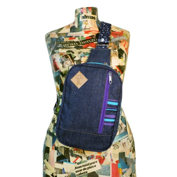 Mochila cruzada, de jean completamente forrada, con bolsillo en frente y bolsillo interno, cierre doble en cuerpo.