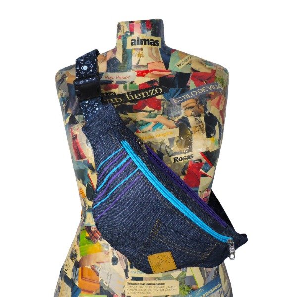 Riñonera en jean, completamente forrada, estampada con vinilo y etiqueta en cuero ecologico.